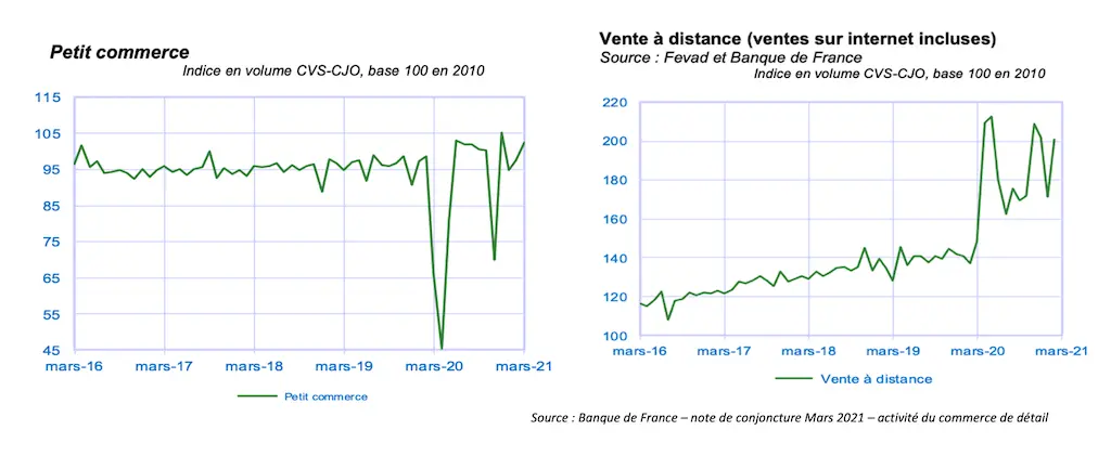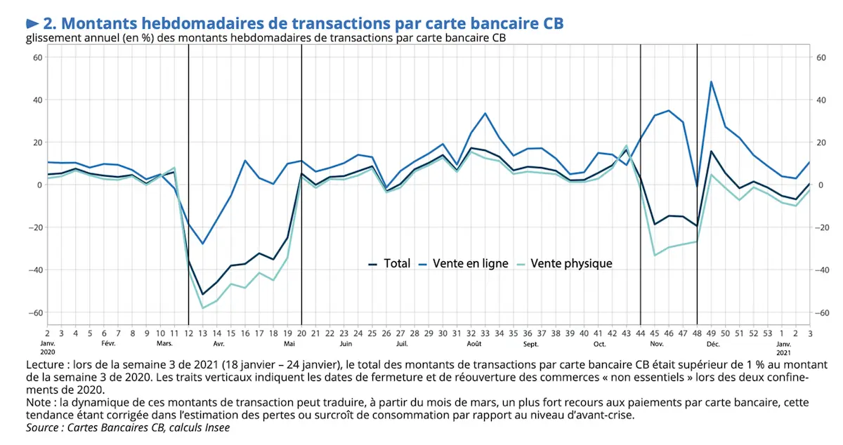 En effet, selon les études de conjonctures publiées par l’INSEE à partir des données de transaction par carte bancaire, la vente en ligne a fortement progressé durant les confinements, mais un rééquilibrage entre les ventes en ligne et les ventes physique s’est opéré durant les périodes de confinement, ce malgré la présence du virus, le télétravail, et les contraintes d’accueil en magasin.
